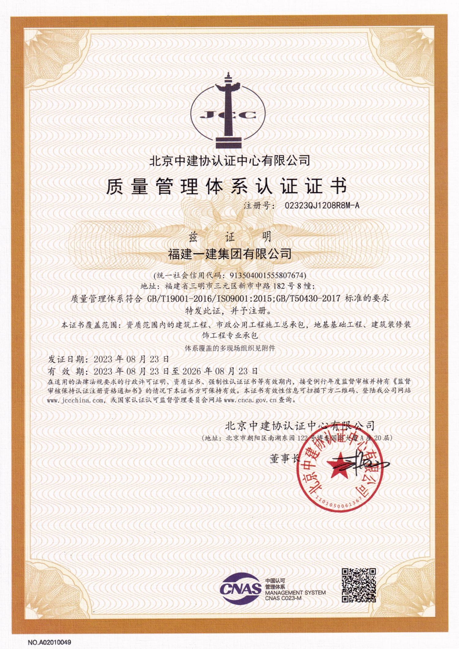 质量管理体系认证证书