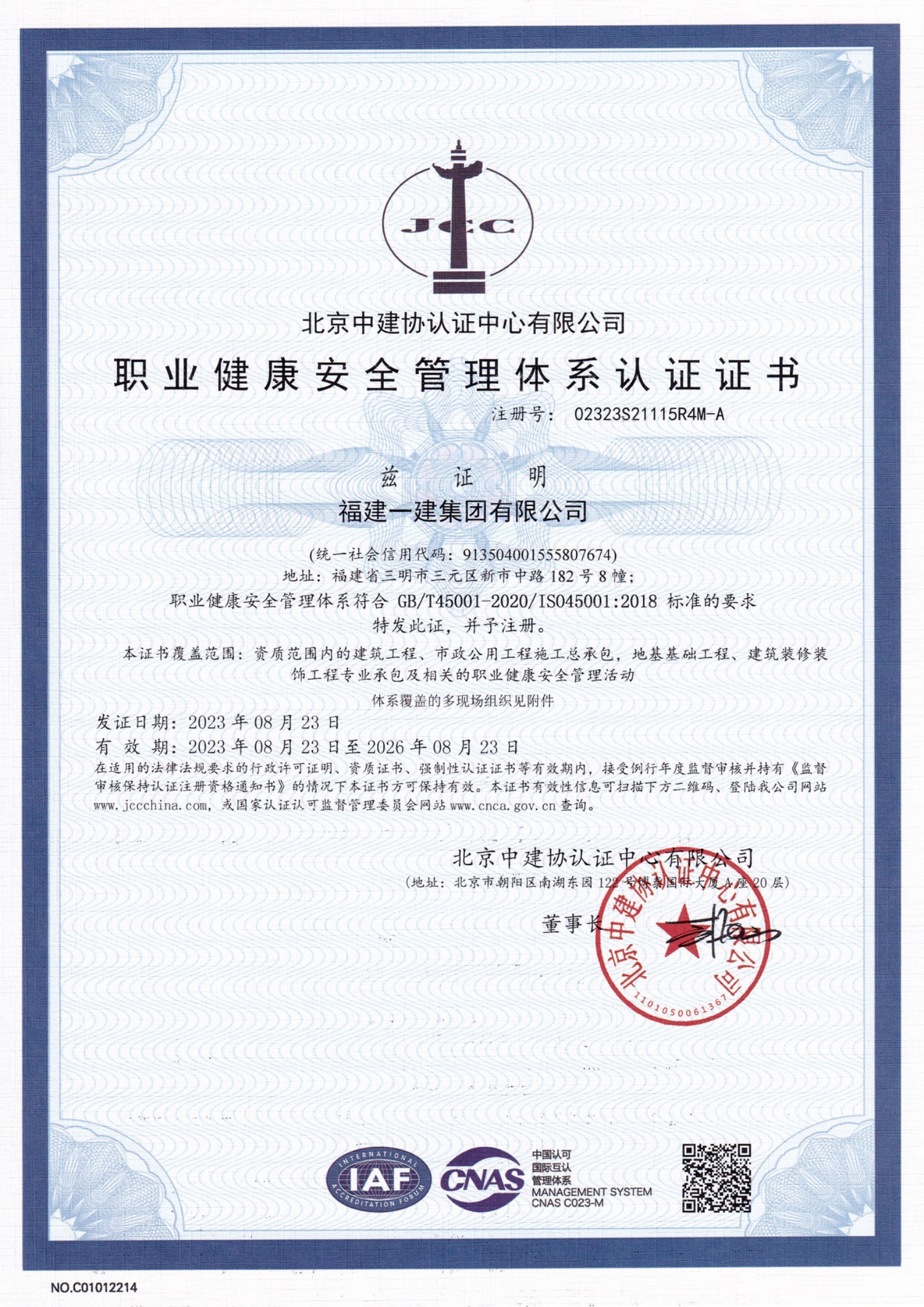 职业健康安全管理体系认证证书