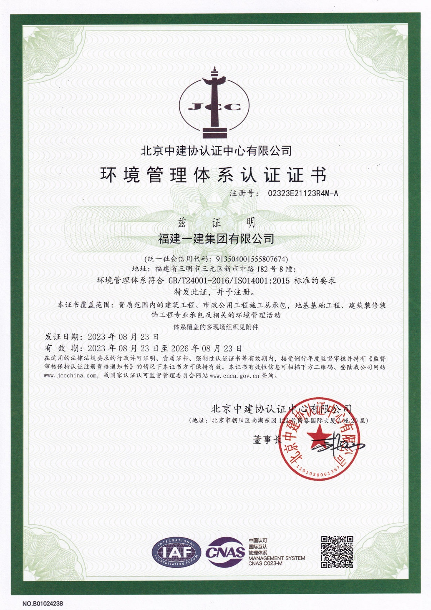 环境管理体系认证证书